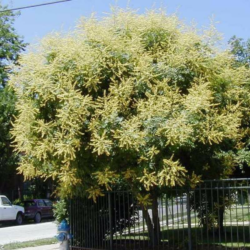A medium-sized ornamental tree valued for its showy midsummer clusters of bright yellow flowers, lantern-like seed pods, and attractive fall color. Tolerant of urban conditions and heat.