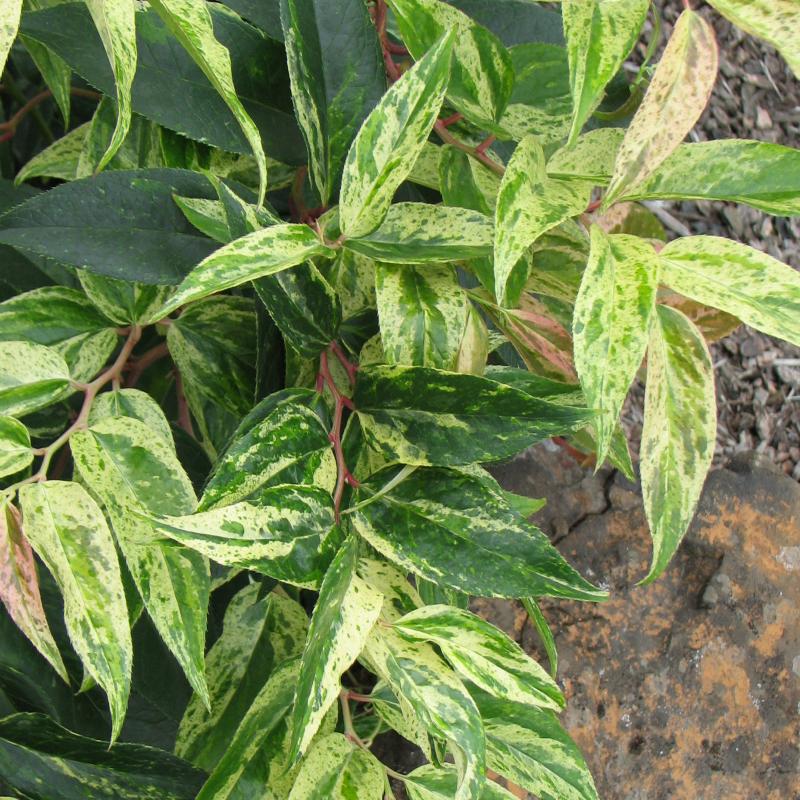 The graceful, red-tinged stems of 'Rainbow' are clad with evergreen leaves splashed with a mix of green, cream and red. Small white flowers that appear clustered along the stem will arrive in June.