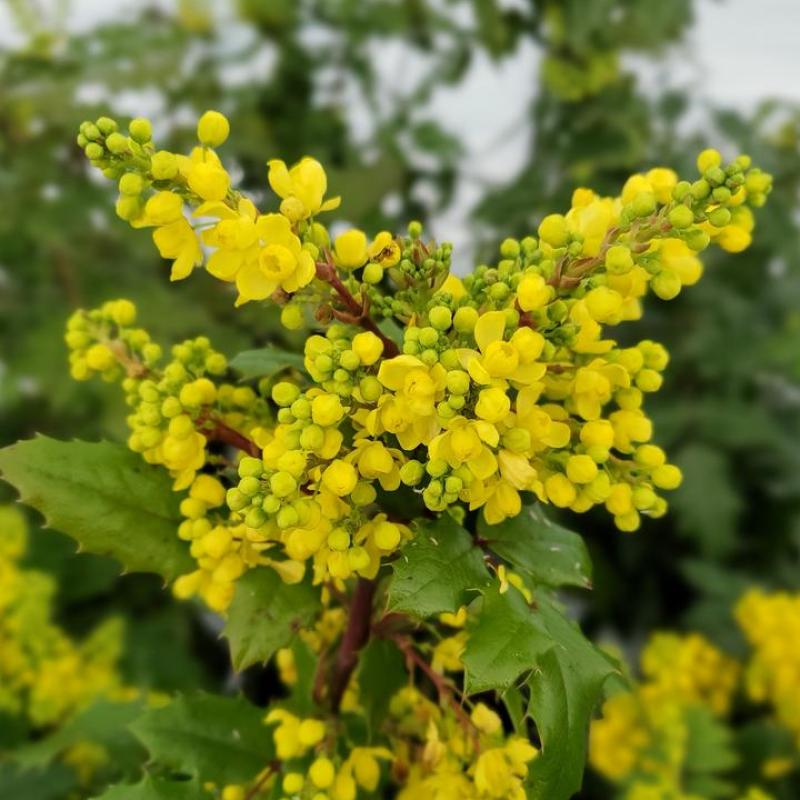 With upright branching and spreading form, this evergreen is distinctive for its Holly-like leaflets that populate its compound foliage, its showy yellow April bloom and its dark purple, edible beries in fall. Deer resistant. Will tolerate semi to full shade conditions and thrive. Attractive early bloom and late summer to fall fruit. Easy to grow and prune.