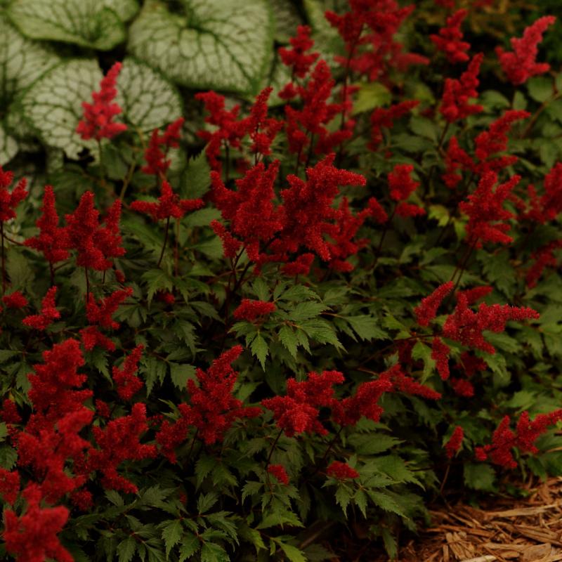 'Fanal' offers narrow, fluffy plumes of bright red flowers in late June and early July that hover airily over its deep green divided foliage.