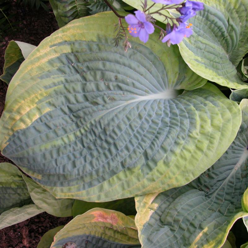 A large-sized plant with dramatic blue-green rounded leaves and bold, uneven golden-yellow borders, 'Frances Williams' will produce near white flowers over its crinkled and cupped leaves.