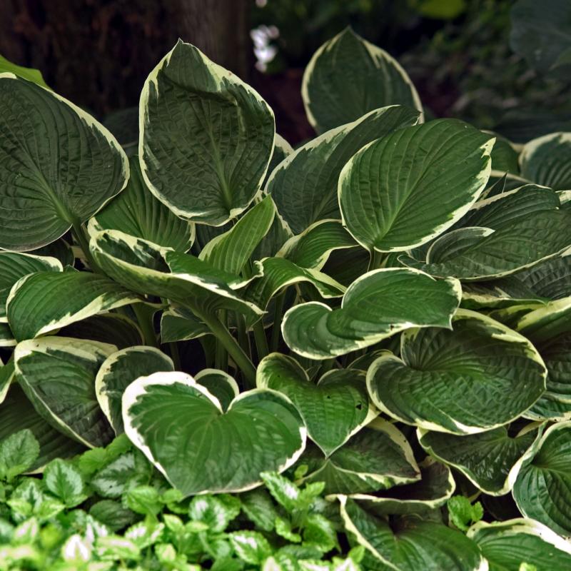 A medium to large plant with dark green, heart-shaped leaves trimmed with a white band, the slightly puckered leaves will tolerate sun nicely. Lavender flowers appear later on.