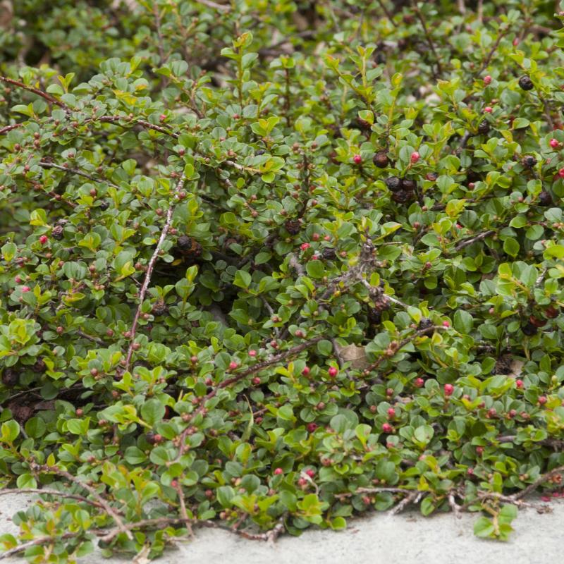 A graceful, low, spreading plant with glossy, dark green leaves and tiny pink-white flowers that are followed by bright red berries. The fruit persists through winter and is shown off by a dramatic branching structure.