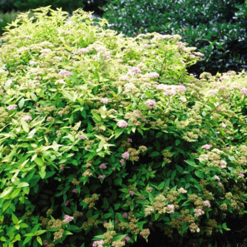 'Goldmound' creates a low maintenance, mounded form that is great for many situations where a shot of brightness is needed thanks to intense deep-pink flowers in June and July amid bright yellow foliage. The blooms will repeat if deadheaded.