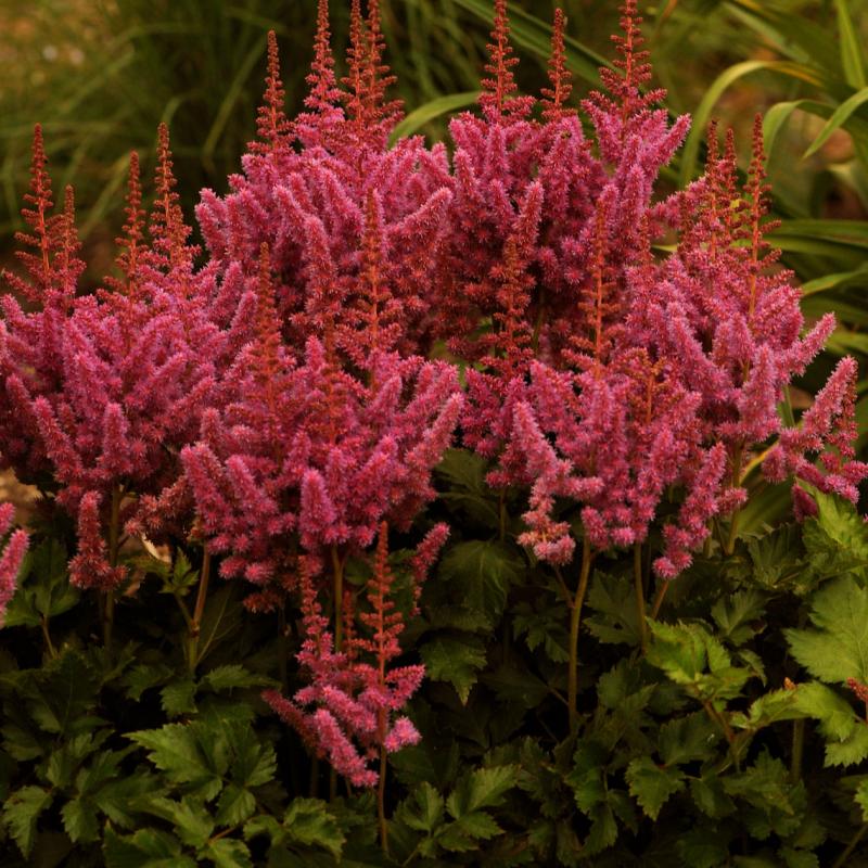 This mid-sized selection features showy, bright rose-mauve plumes over a compact mound of elegant, lacy dark green leaves.