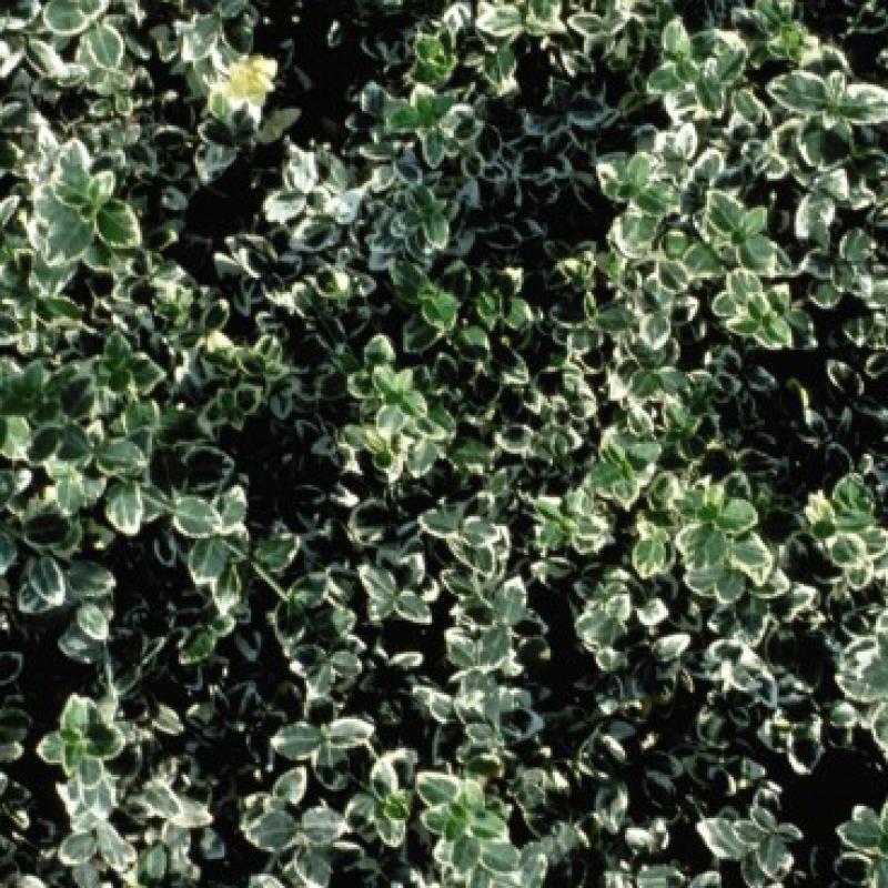 Vibrant green and cream evergreen foliage forms a mounding to sprawling habit on this plant that can climb rough textured surfaces or be pruned into a compact mound. 'Emerald Gaiety' will also turn pinkish-red in winter.