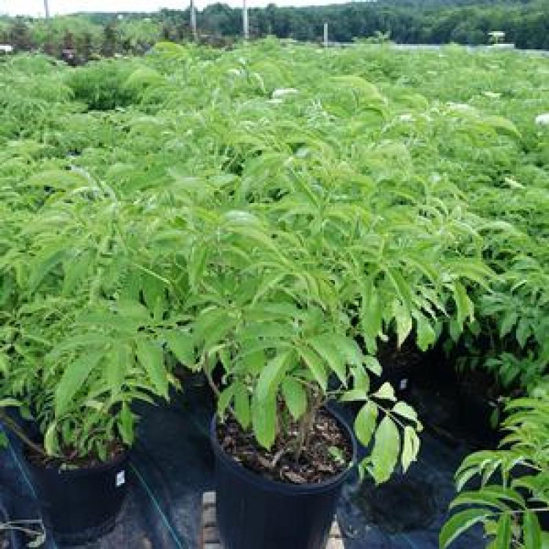 'York' showcases large umbels of pure white flowers in late May and June that will turn to edible purple-black fruit which is also larger than the species. Deep green, divided foliage that turns an attractive golden-yellow in fall completes the look.