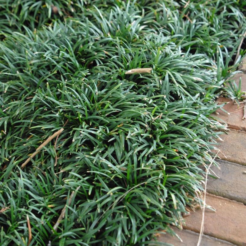 An excellent evergreen groundcover in shade and rock gardens, 'Nanus' offers short, dark green, grass-like foliage and violet flowers on short stalks that are followed by glossy dark purple berries.