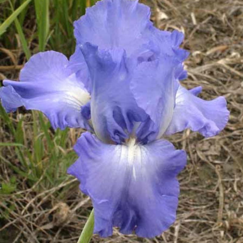 Huge light blue flowers with a white blotch on the falls appear from May to June and then repeat in fall if well fertilized.