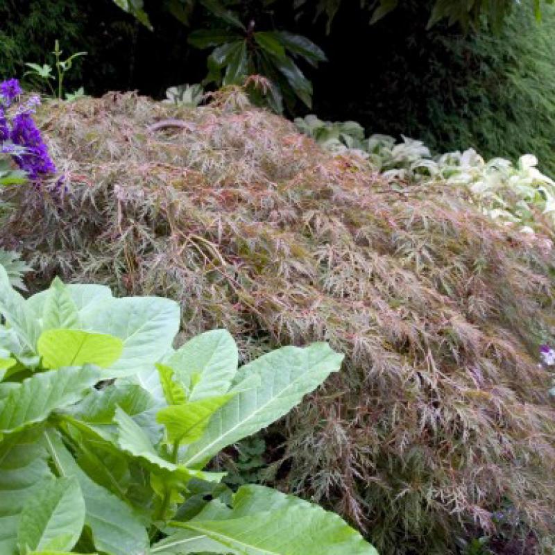 A weeping tree with deep red, heavily dissected leaves that change to deep burgundy in the season, this is one of the oldest forms of Japanese Maple and holds its color better than most varieties.