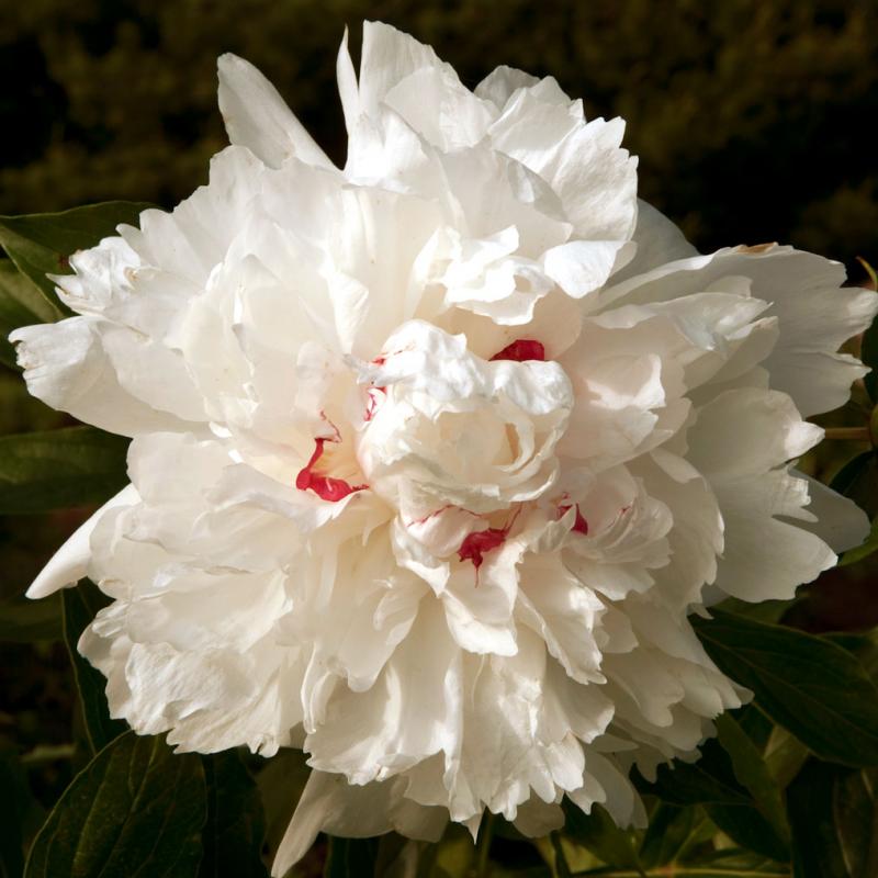 Large, double white flowers with sporadic red markings are the hallmark of this fragrant early-season bloomer.