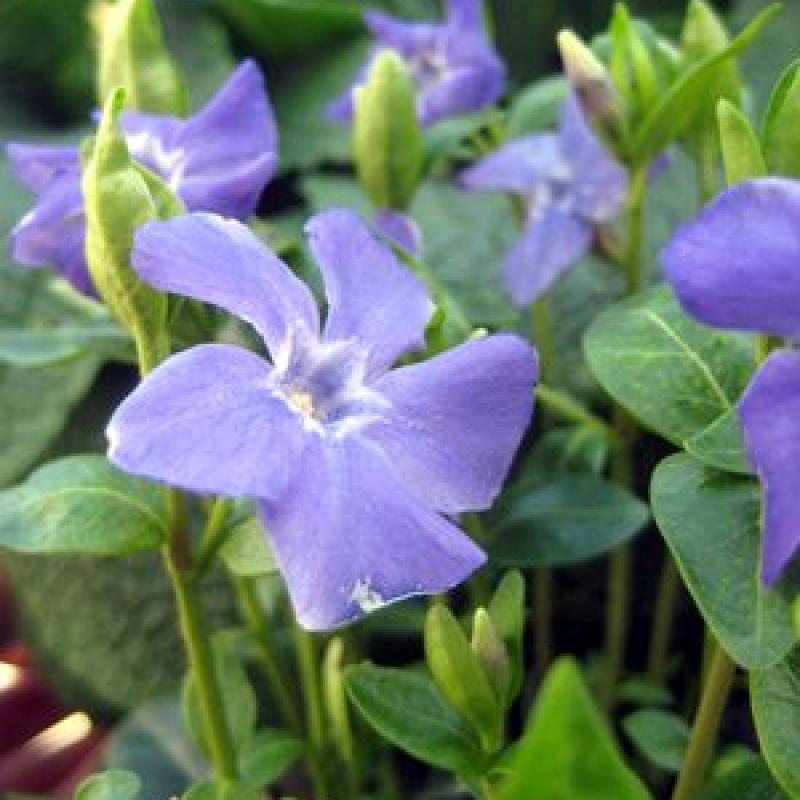 A vigorous and popular groundcover with glossy evergreen foliage and abundant violet-blue flowers in spring, with sporadic blooms into summer. Excellent for erosion control and carpeting shady areas.