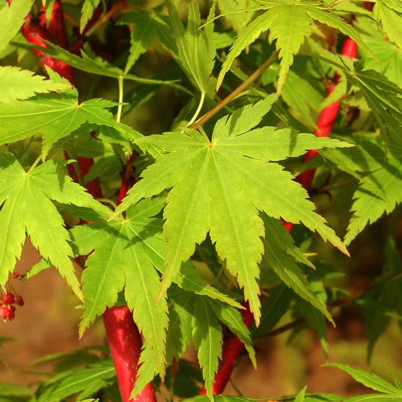 Widely known as the Coral Bark Maple and popular for its flaming, coral-red bark that stands out in winter and early spring, the leaves of this variety emerge in spring with a flush of bright, yellow-orange and change to soft green for summer.