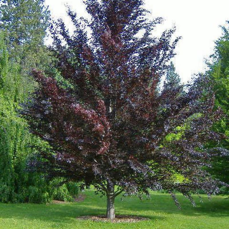 A stately tree with lustrous purple, almost black leaves in spring which change to purple-green. Smooth and satiny gray bark and an open pyramidal form in youth forms a rounded silhouette with age.