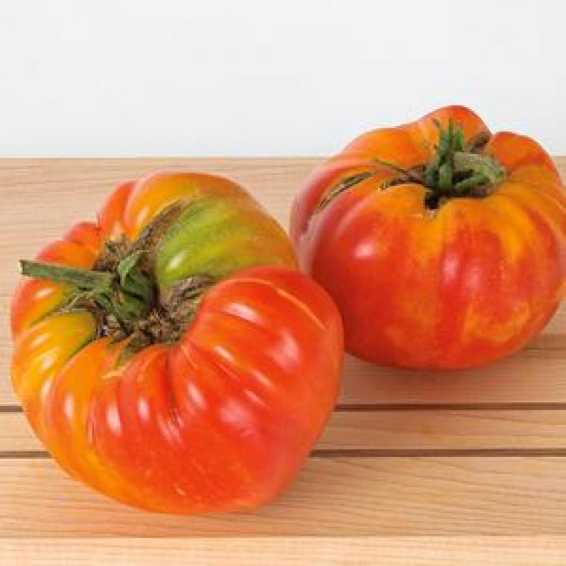 'Striped German' produces moderate sized fruits with a bi-colored center of yellow with red marbling and great tomato flavor.