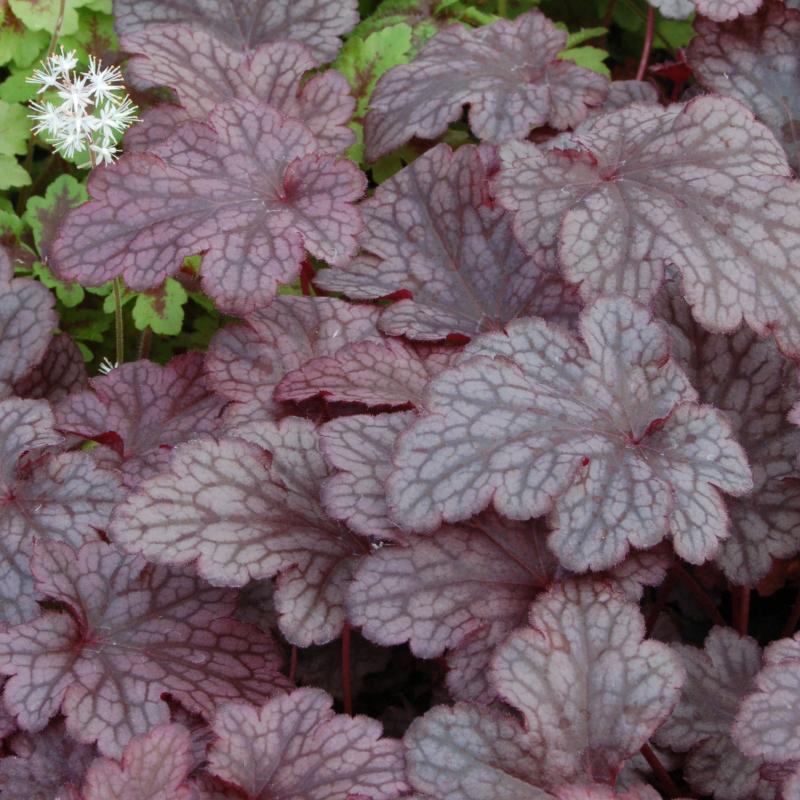 The striking plum purple foliage of this variety has metallic silver highlights that adds an important high contrast dynamic to green, shade dappled gardens. A small mounded stature and spreading habit makes it versatile where space is limited.