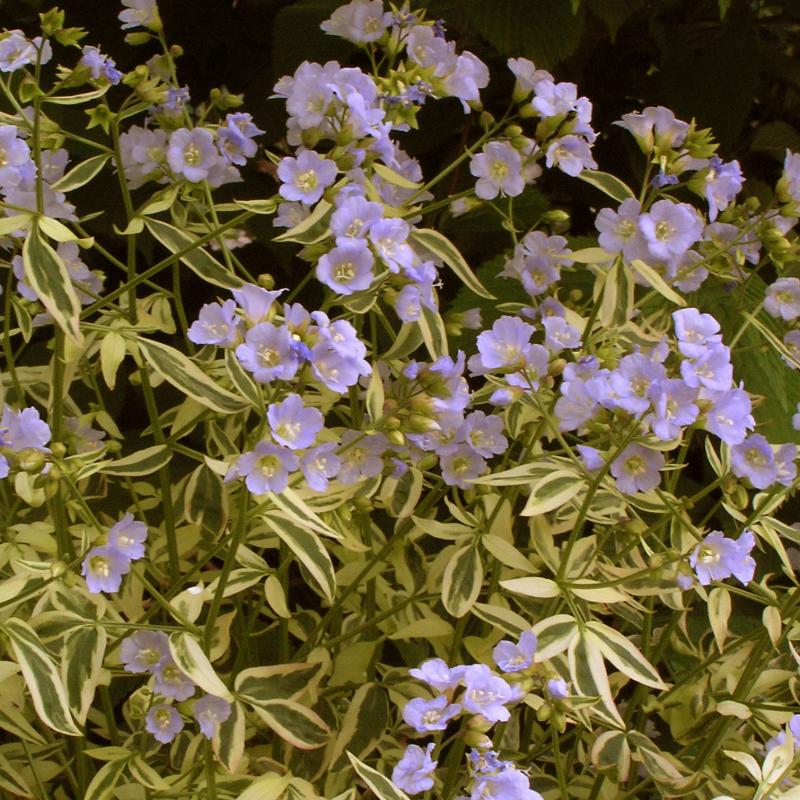 This vigorous plant produces intense, very light blue-purple, fragrant flowers from early June into July over foliage that is variegated with cream and light pink.