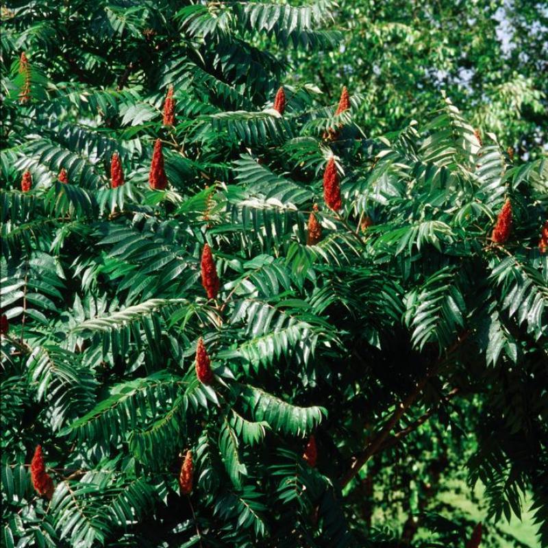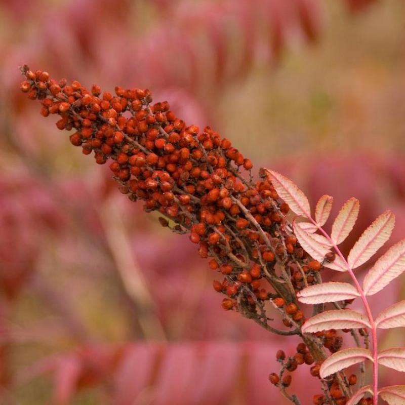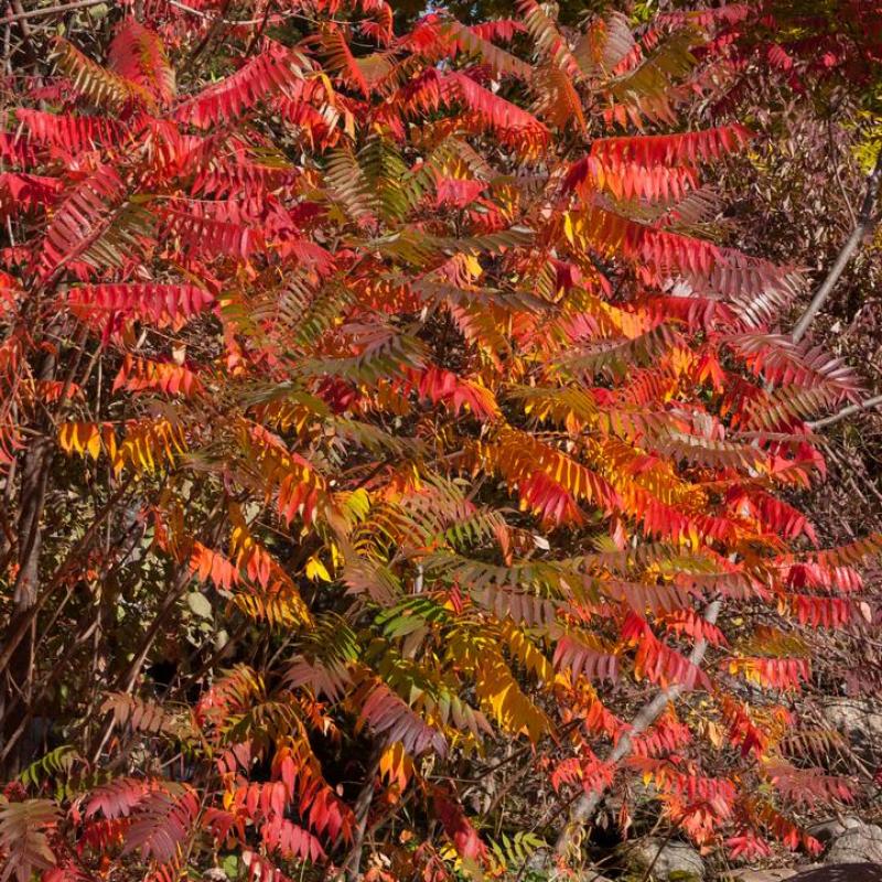 A fast-growing native shrub or small tree with bold, tropical-looking foliage and striking seasonal interest. Smooth Sumac produces upright clusters of greenish-yellow flowers in early summer, followed by fuzzy red fruit that persists into winter. Its fern-like leaves turn brilliant shades of scarlet, orange, and purple in fall, making it a standout for naturalized areas and large landscapes.
