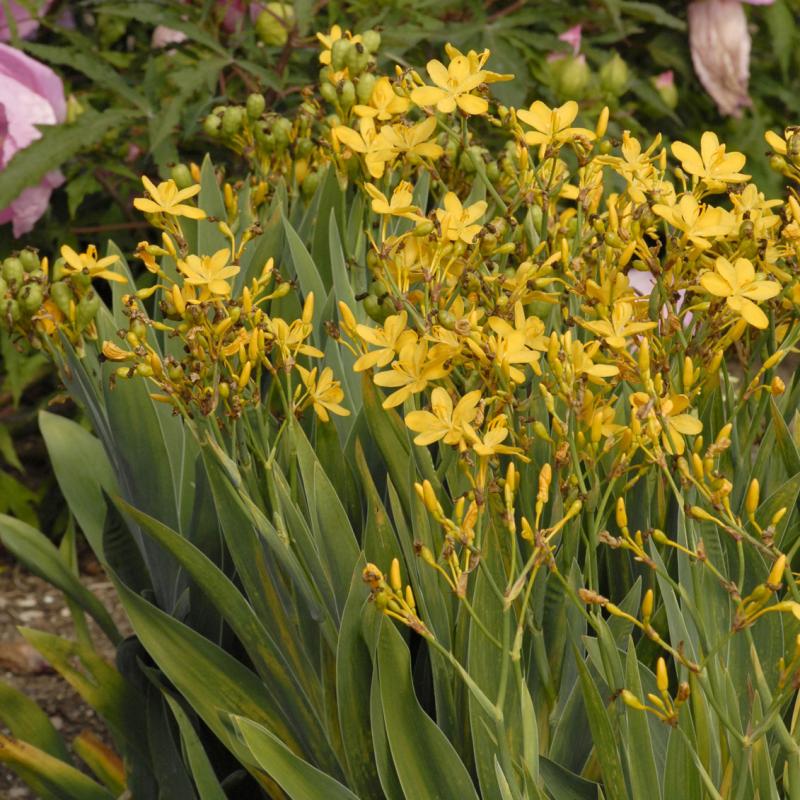 A dwarf cultivar that produces foliage up to only 10" tall with flower spikes 18-20" tall. The lily-like, unspotted, butter yellow flowers have 6 petal-like segments and appear in early to midsummer.