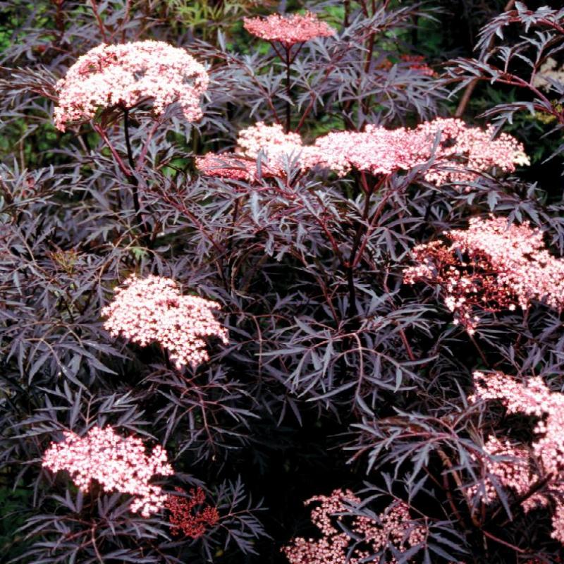 The black-purple foliage of 'Black Lace' provides interest all season, but looks especially rich when the soft pink blossoms appear in early summer. Masses of blooms will cover this plant and give off a slight lemon fragrance.