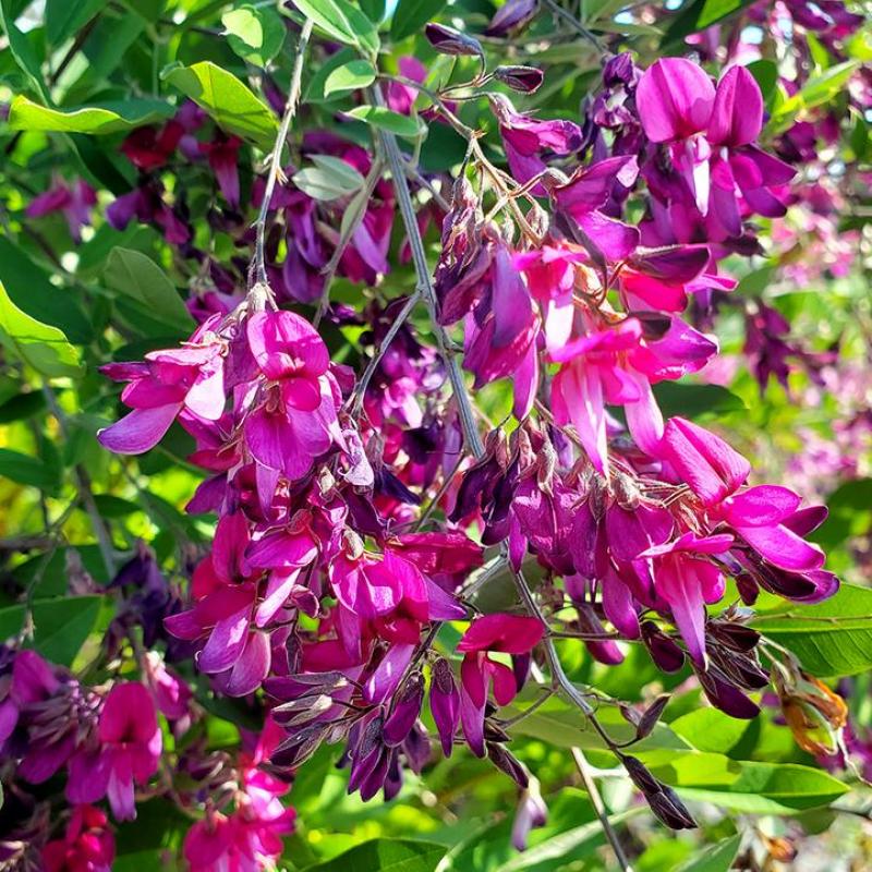 An arching, deciduous shrub with cascading stems covered in vivid rosy-purple flowers from late summer into fall. ‘Gibraltar’ adds graceful movement and a burst of late-season color. Ideal for sunny slopes, borders, or as a specimen.