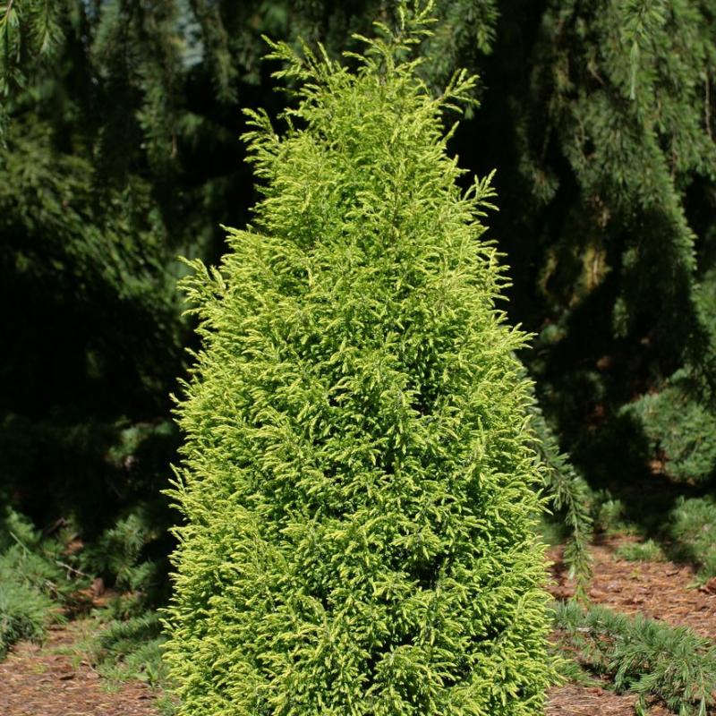 'Gold Cone' creates a columnar form with luminescent, bright golden yellow foliage in spring and summer. This easy, narrow plant offers a wonderful contrasting form and color for many types of gardens.