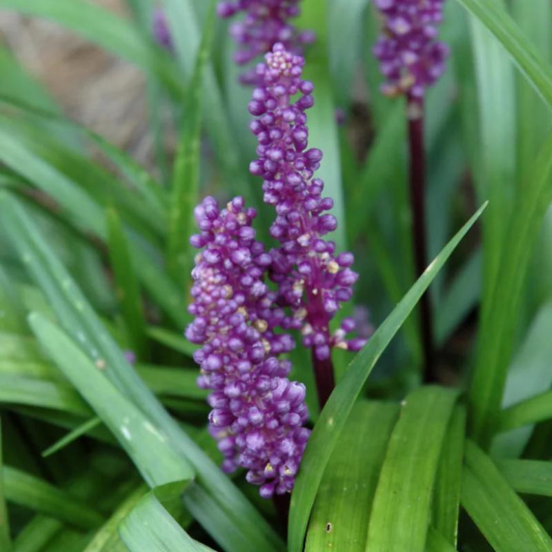 A clump-forming perennial with dark green grass-like foliage and dark purple flower spikes rising above the foliage. Prefers full sun to light shade in moist, fertile soils. Tolerant of dry, sunny areas. Mow high with a sharp blade in early spring before new growth begins. Outstanding ground cover for sun or shade. Almost indestructible in the landscape.