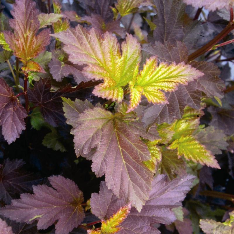 The new maple leaf-shaped foliage of 'Center Glow' is a striking burgundy-red color with a bright yellow base before maturing to deep burgundy. Pink-tinged clusters of white flowers arrive in July.