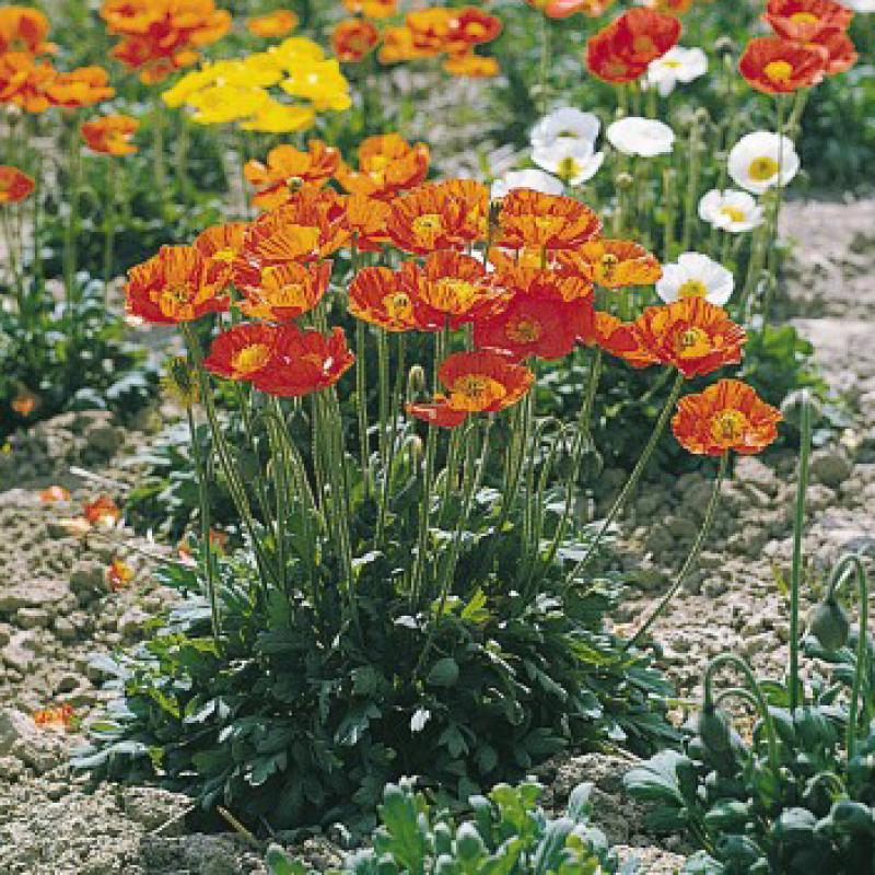 Features low-growing rosettes of gray-green-lobed foliage that reach 4-6 inches tall and attractive 2" crepe paper-like flowers in shades of orange, white, yellow and coral that are presented on elegant stems from May to June.