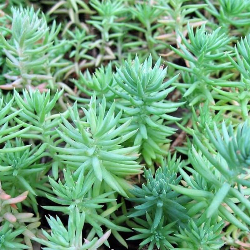 This variety generates a mass of spreading, blue-green, foliage that resembles Blue Spruce needles. It will thrive in sunny locations and sandy soils. Intense sulfur yellow flowers in July complete the look.