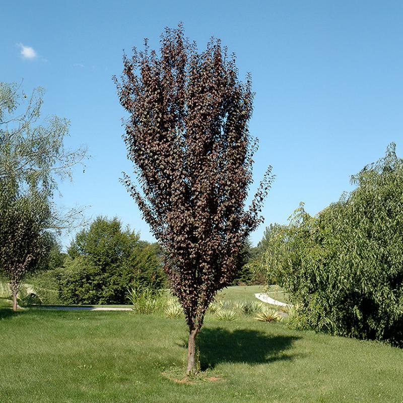 A striking columnar flowering plum with deep purple foliage that holds its color from spring through fall. In early spring, branches are adorned with fragrant white-pink blossoms before the leaves emerge, creating a dramatic seasonal display. Its narrow, upright form makes it perfect for small landscapes, streetscapes, or as an architectural accent.