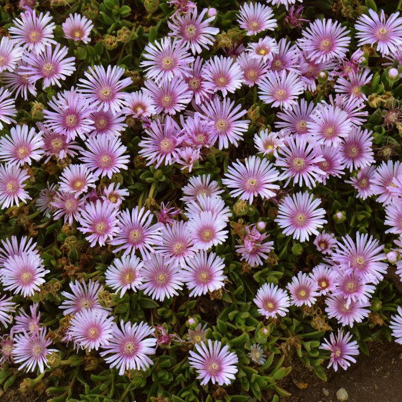 Features silvery, lavender-pink, 2" flowers that resemble daisies and bloom above succulent gray-green foliage from early June through fall.