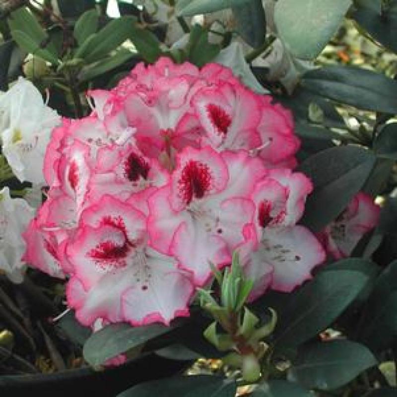 This variety's large trusses of flowers have a white background with ruffled dark raspberry-pink edges and a deep raspberry blotch on the centermost petal. It will bloom in late May over compact mounds of dark green glossy foliage.