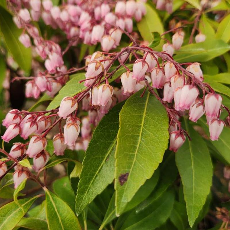 Make your landscape memorable year round with this amazing broadleaf evergreen. 'Katsura' cloaks its dense, rounded form with wide, shiny, deep green foliage and each stem is topped with a string of buds in early spring. The buds open in April to reveal scented white Lily of the Valley bells infused with pink followed by a spectacular show of wine red color on emerging new foliage in May!