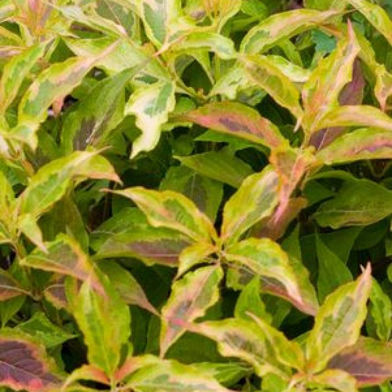 'My Monet Sunset' is a very dwarf Weigela that has attractive gold foliage splashed with cream, green and pink. Fall will intensify the color show. Grown primarily for its colorful foliage, it will occasionally produce soft, rosy pink flowers in June.