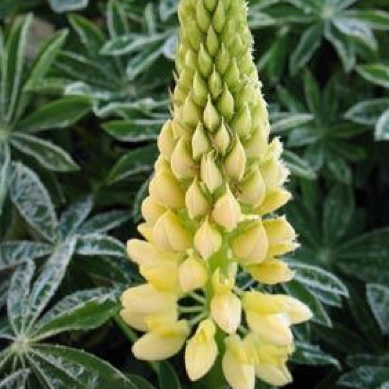 A handsome, compact form of lupine with deep green, palmate foliage and spikes of yellow in late May to early June.