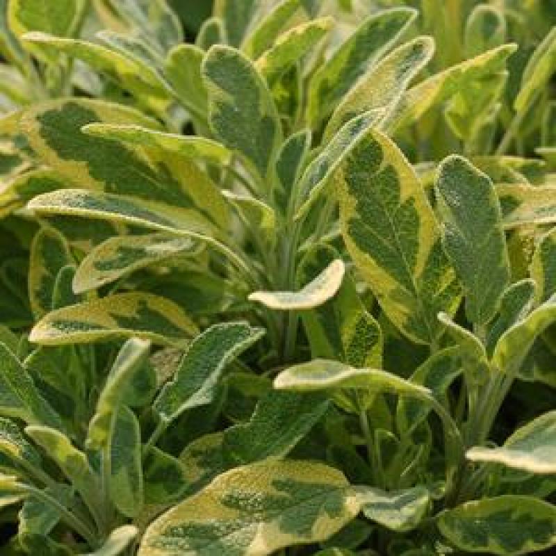 A gorgeous garden plant as well as a culinary herb, this variety offers striking variegated leaves along with lavender-blue flowers in the spring.