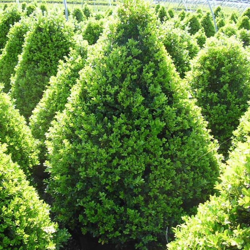 A dense, upright boxwood with a naturally conical shape that requires minimal pruning. Bright green new growth matures to rich, dark green and holds its color well through winter. Ideal for formal plantings and containers.