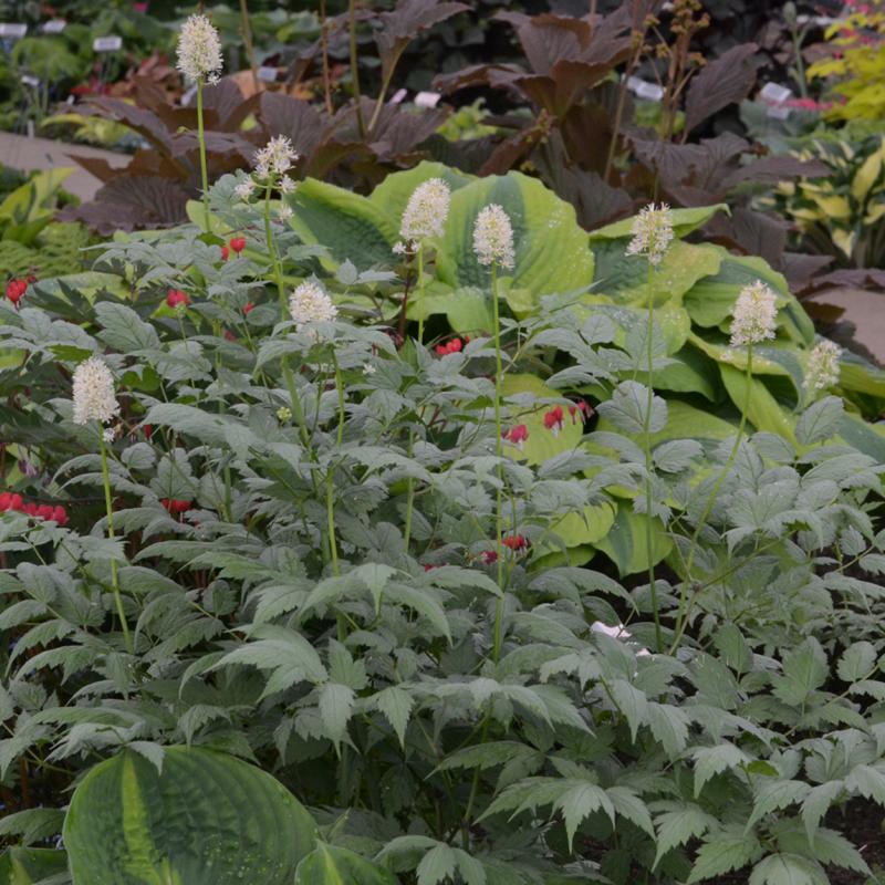 The soft minty blue-green, divided foliage of this variety provides a beautiful backdrop for white bottle brush flowers in early June. Early fall brings spires of small white fruits with black "eyes" on striking red stems.