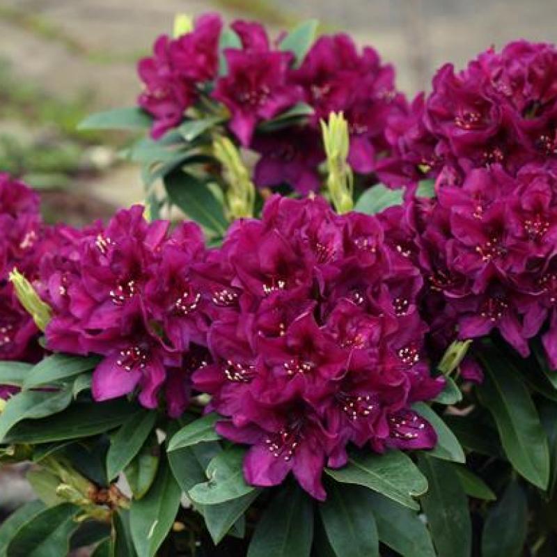 Unique form, bud color, and flower color will make this Rhododendron an unforgettable landscape experience. Tight, low and spreading, this broadleaf Rhododendron will mature twice as wide as tall with a pleasing form that is perfect where height issues are paramount. Leathery, dark green leaves populate its branches and serve as the backdrop for striking, bulbous, branch ending buds that turn nearly black as they expand in mid to late May to expose the first glimpses of flowers color. When the buds open fully, frilly deep, dark purple flowers form huge trusses that cover the plant with this rare, very showy color. What a sight and what a perfect, well behaved plant for morning sun/afternoon shade conditions!