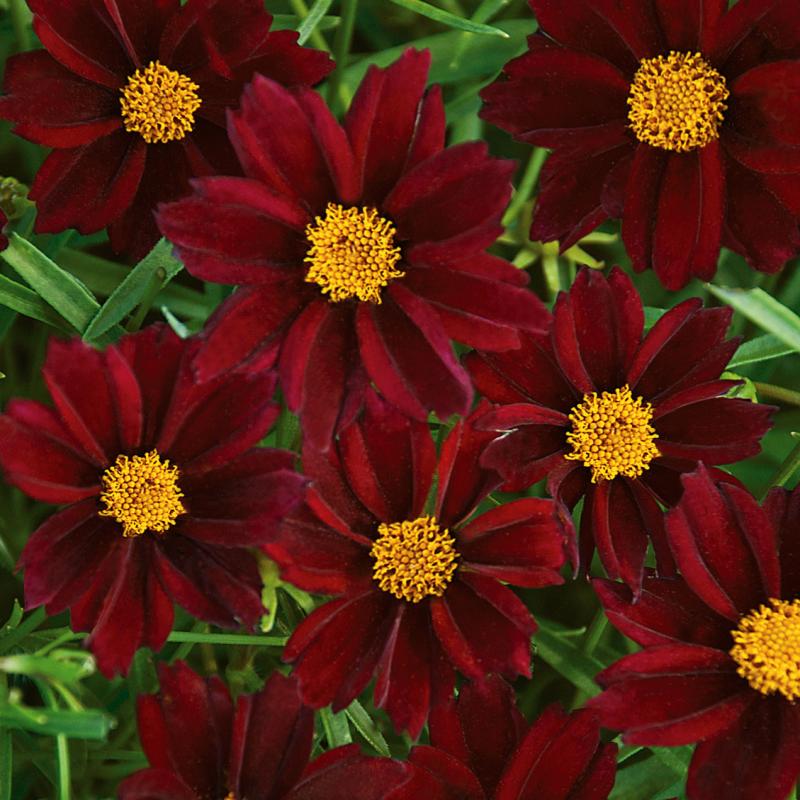 'Mercury Rising' produces velvety wine-red flowers with gold centers that cover fine deep green mounds of foliage and last all summer.
