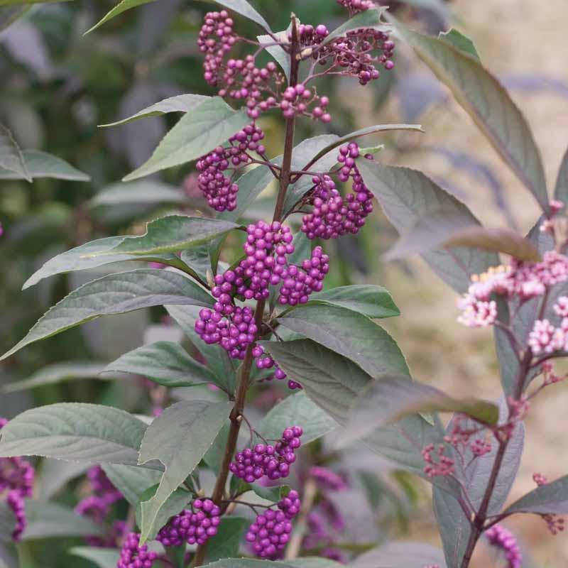 ‘Purple Pearls’ dazzles in the landscape with rich purple foliage, soft pink summer blooms, and brilliant clusters of violet berries in fall. The showy fruit persists well into winter, providing stunning seasonal color and food for birds. Compact and easy to grow, it’s a standout in borders or mixed plantings.