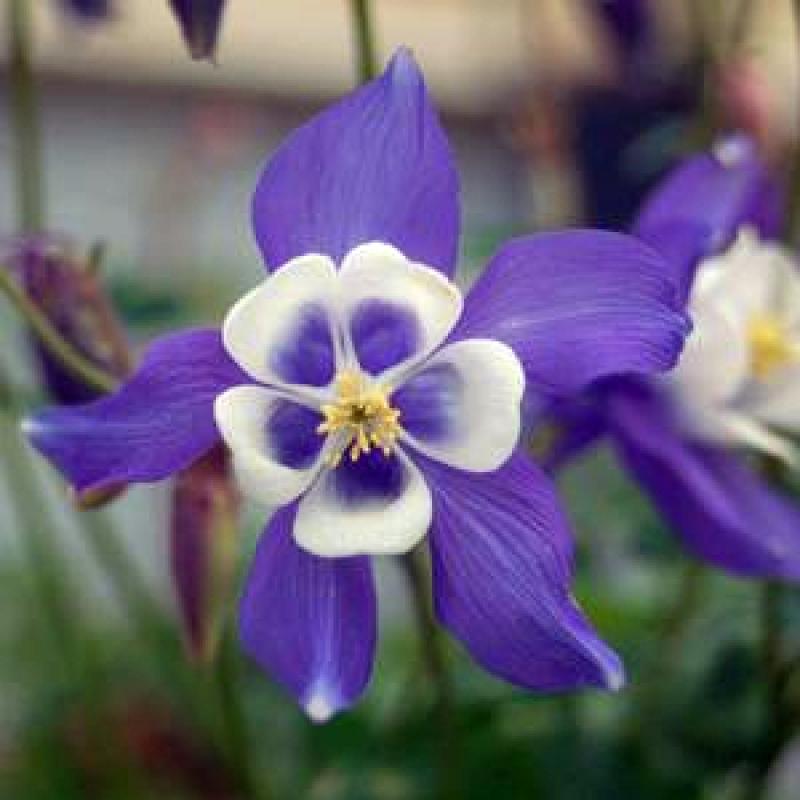 Upward-facing, short-spurred, bicolored flowers of blue and white emerge in late May to June on this compact plant with charmingly lobed green-gray foliage.