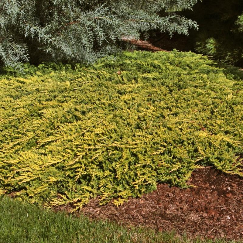 The dense, golden foliage of this carpet-like juniper takes on a third dimension as elongated streamers of new growth appear to float over the body of the plant and creep beyond the edges.