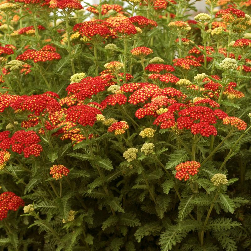 Large corymbs of true red flowers with gold centers appear in the summer before fading to muted tones and forming a pleasing tapestry of color. The feathery aromatic foliage with silver highlights completes this selection.