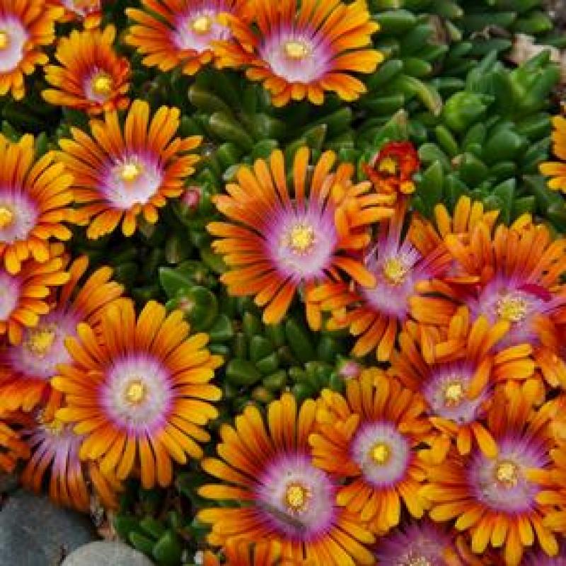 'Fire Spinner' offers tri-colored daisy-like flowers of orange, red and fuchsia that cover a tight, fast spreading mat of succulent evergreen foliage. The blooms appear in June and then rebloom throughout the summer.