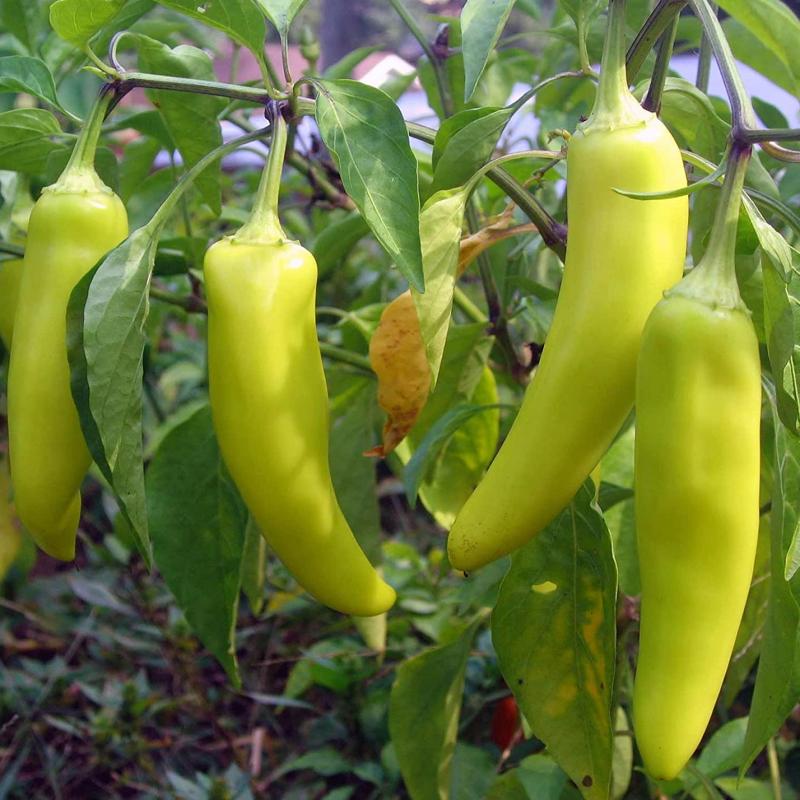 A mild heirloom variety with very early, slender, yellow, all-purpose fruit which is approximately 4" long, tapering to the end. If held to maturity, the waxy yellow flesh will turn bright red. Rated 0-500 on the Scoville pepper heat scale.