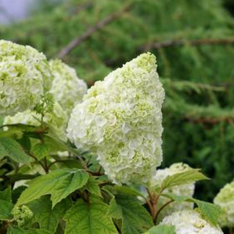 A dramatic oakleaf hydrangea with exceptionally large, upright cones of bright white flowers that hold their color well through summer. Bold, deeply lobed foliage adds strong texture and turns rich shades of red and burgundy in fall.
