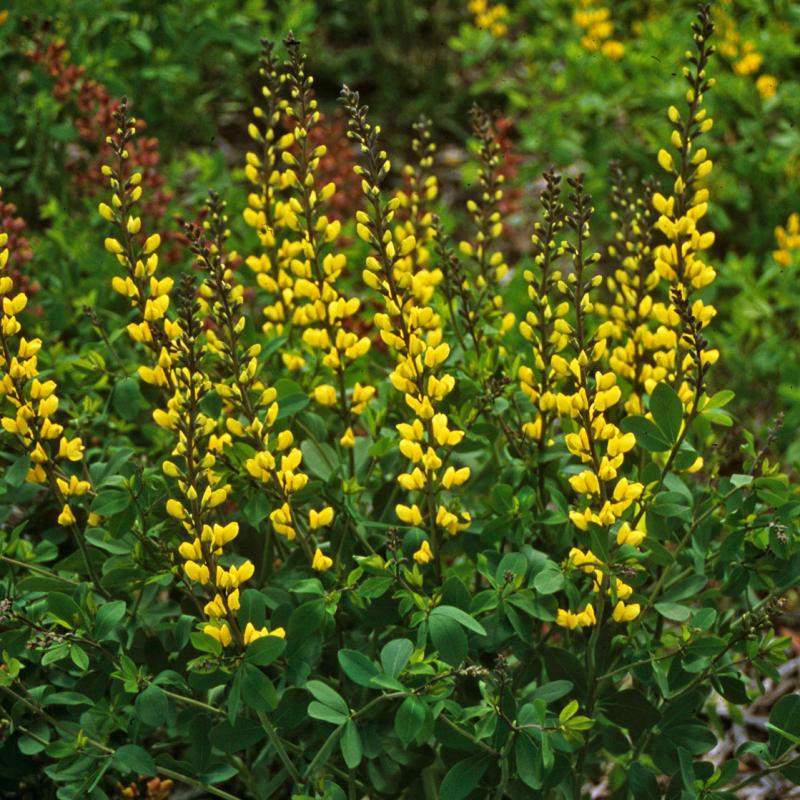 Spikes of smoky purple buds open to contrasting lemon-yellow flowers in late May and June amid upright sturdy clumps of gray-green, pea-like foliage.