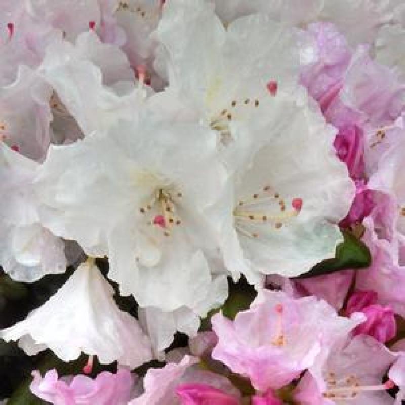 Lilac-flushed buds open to large trusses of pure white flowers with a green-yellow throat on this vigorous, wide, upright plant with deep evergreen leaves.